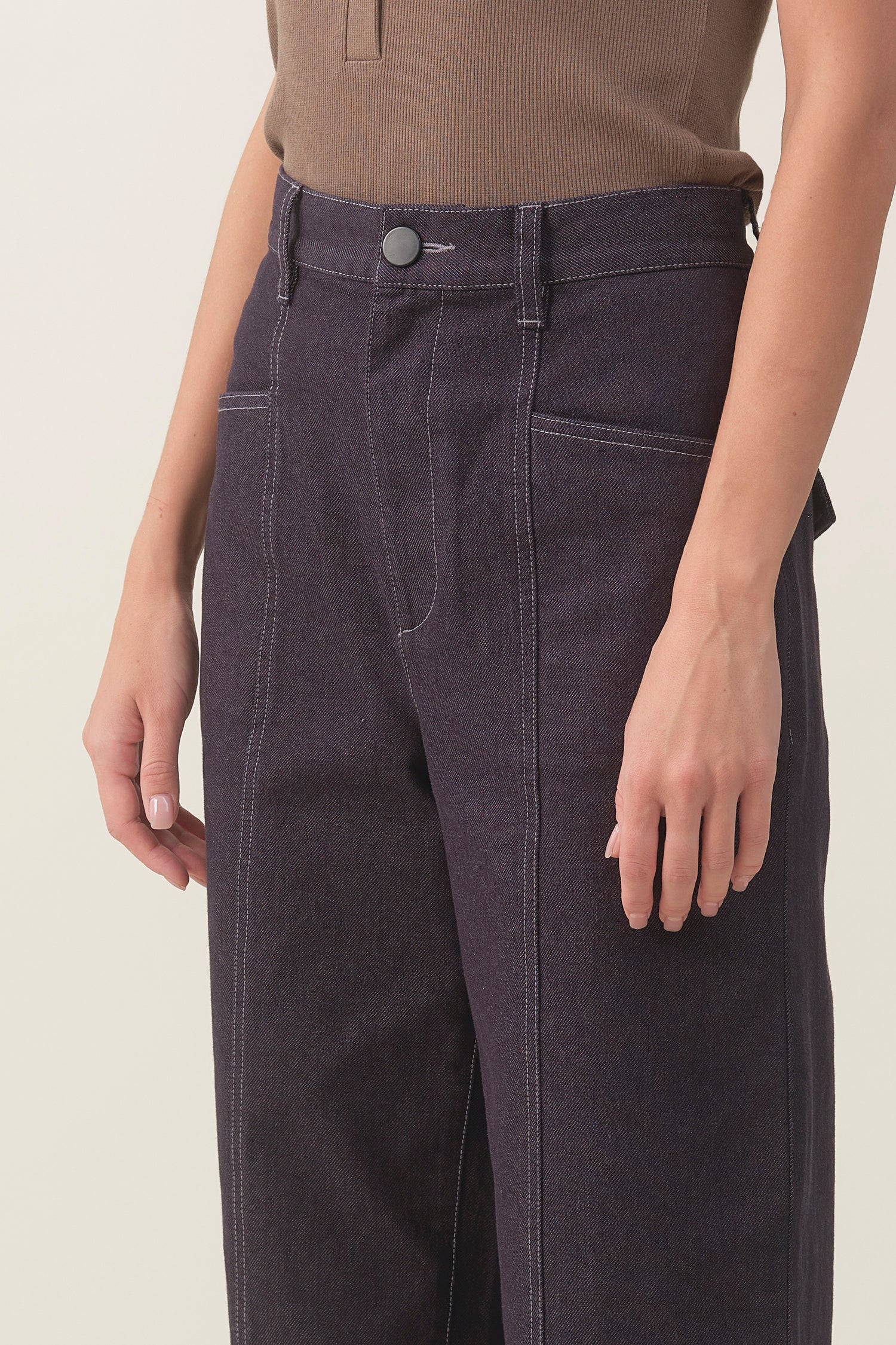 The perfect combination of timeless style and modern comfort, this pant truly goes with anything! Featuring a nipped waist with an elastic waistband, a leg-lengthening fit, and complete with contrast stitching on the front and back pockets. This has been crafted from a special cotton fabric imitating dark denim, without the pollution of real indigo dyeing.