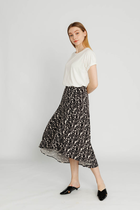Pull-on Midi Wrap Skirt - Black Botanical