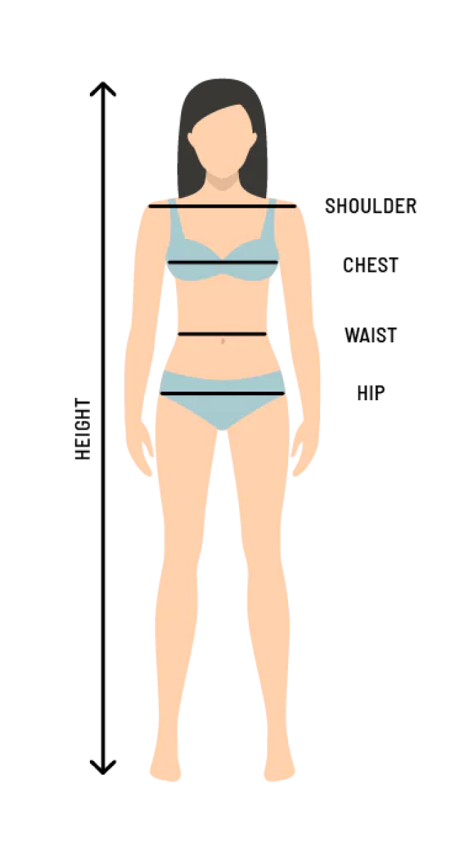 An approximate indication for how similarly the clothes' length will fall on you versus our photos.