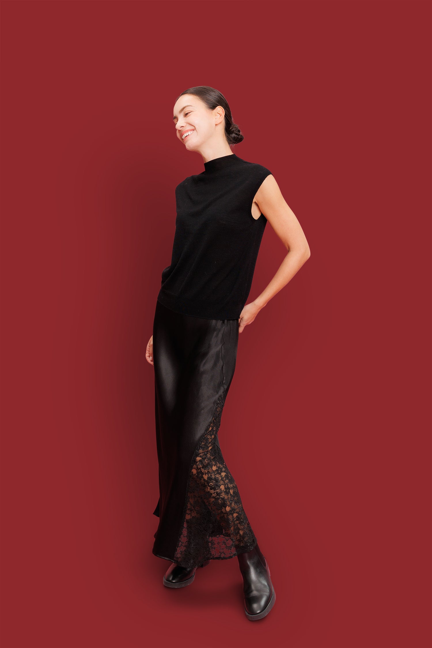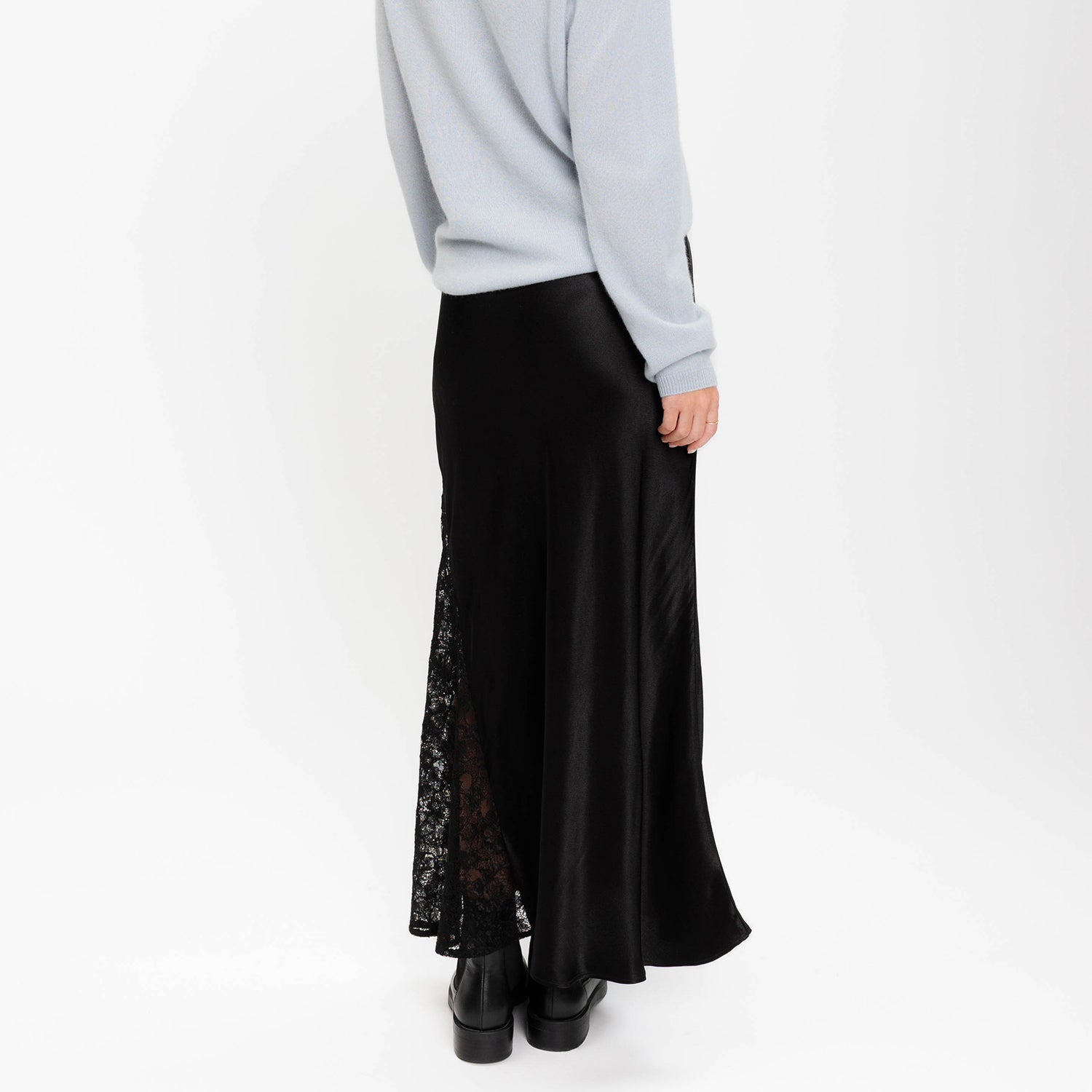 Our stunning satin skirt puts a modern twist on timeless elegance. Designed with a floral lace panel and a flattering bias cut, it enhances your outfit with movement and flair. You can't fail whether pairing this with a relaxed sweater or with our coordinating Cowl-neck Satin Blouse. Crafted from a luxurious satin made from sustainable Ecovero viscose.
