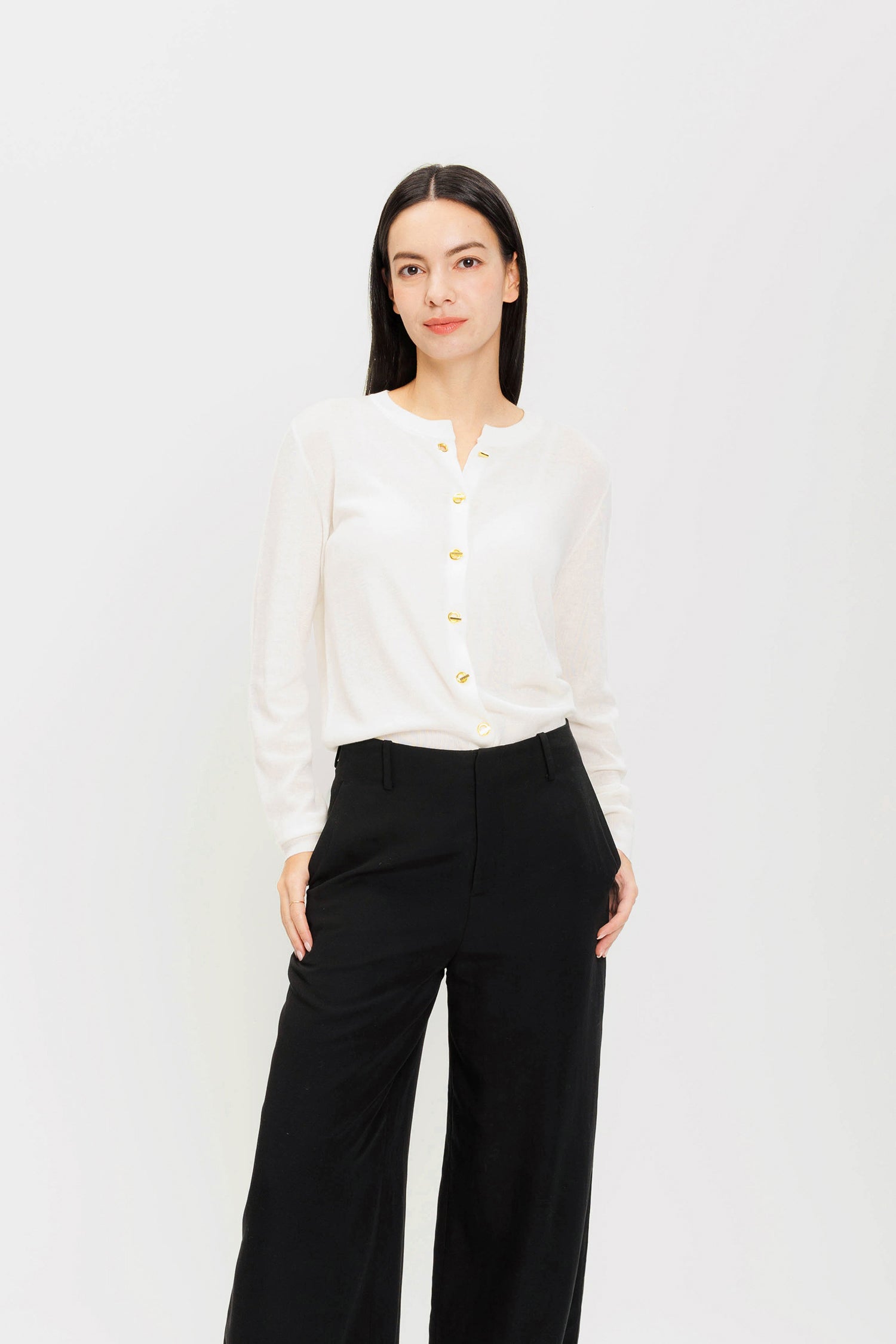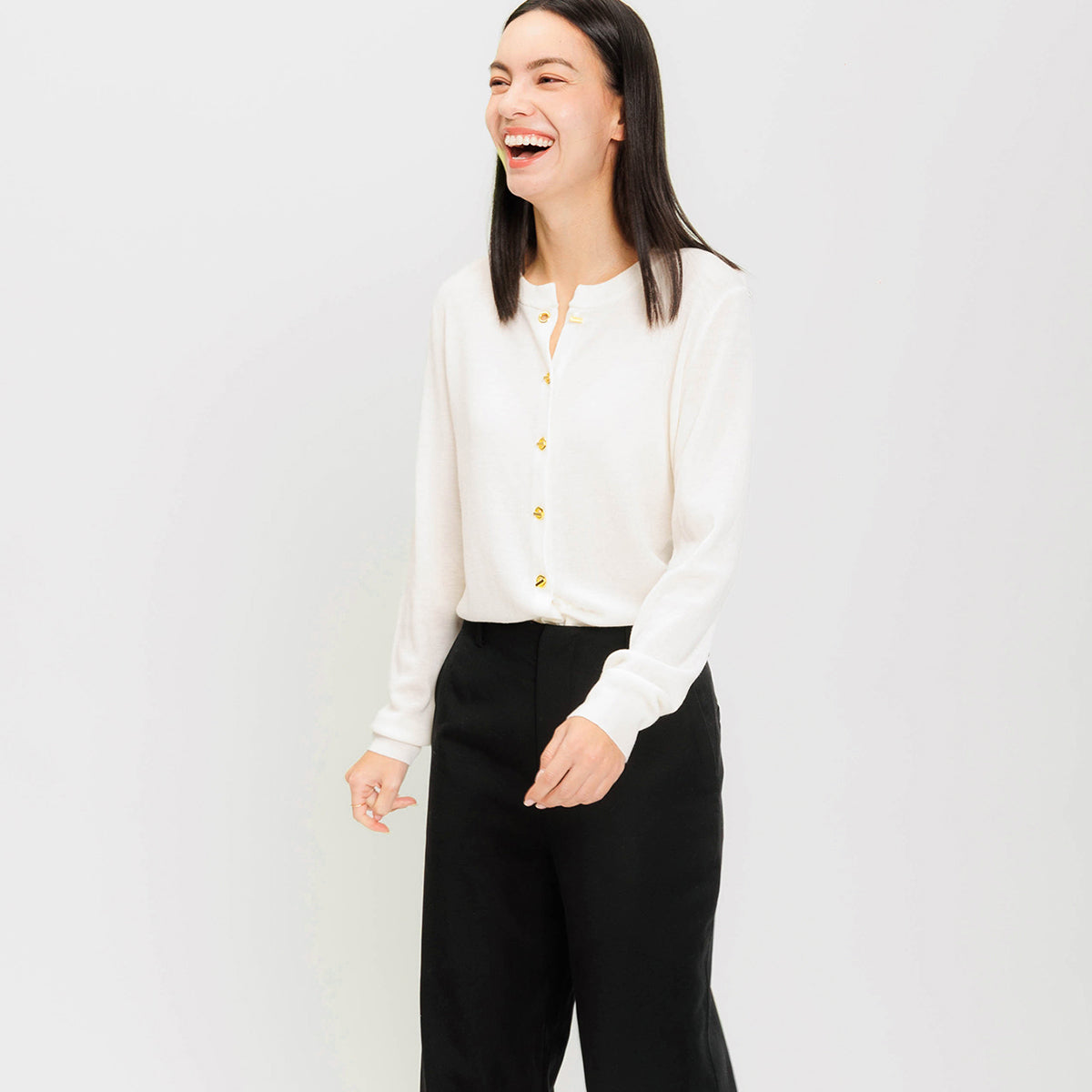 Add a touch of sparkle to your winter closet. Our effortless wool cardigan strikes the balance between day and night, blending an easy fit with distinctive gold buttons. Wear it casually open with a tank top and denim, or style it as a chic top for an festive evening.