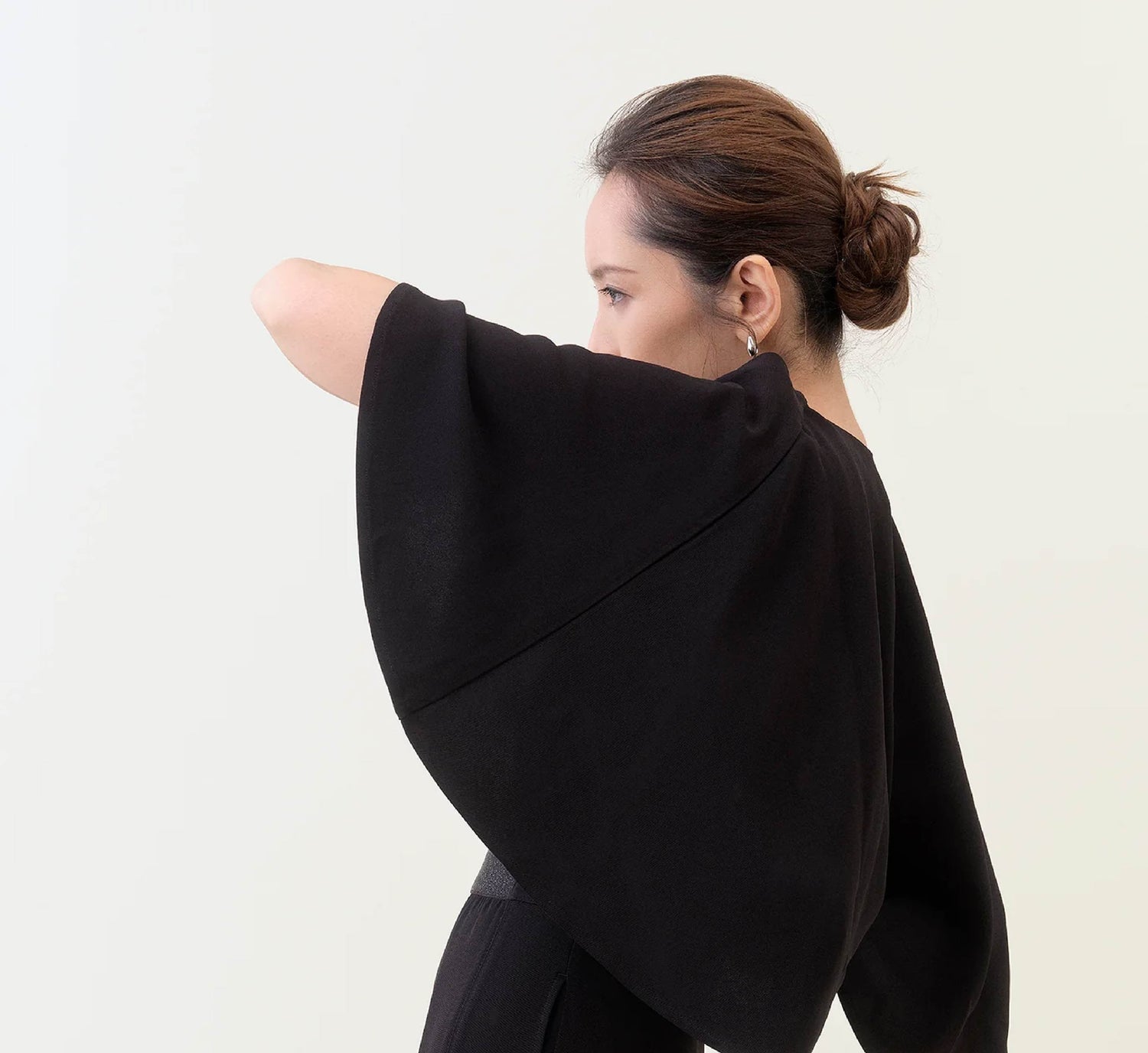 Our luxurious jumpsuit adds a perfect touch of glamour to the holiday season. With a subtle sparkle in the elastic waistband and a low-cut back, this look exudes modern sophistication. An optional cape snaps into the shoulders, to keep you elegantly cozy on cooler nights.