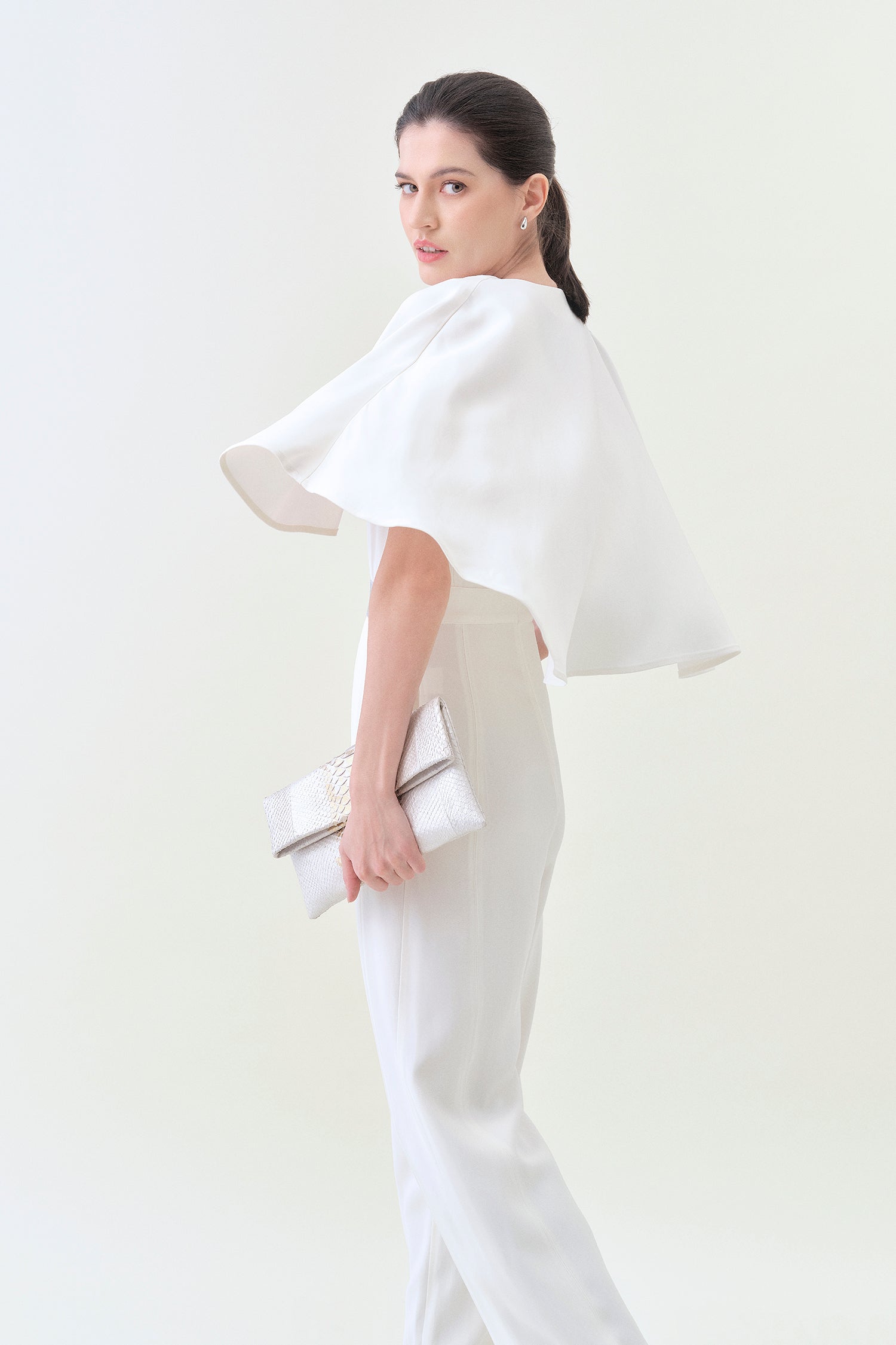 Our luxurious jumpsuit adds a perfect touch of glamour to the holiday season. With a subtle sparkle in the elastic waistband and a low-cut back, this look exudes modern sophistication. An optional cape snaps into the shoulders, to keep you elegantly cozy on cooler nights.