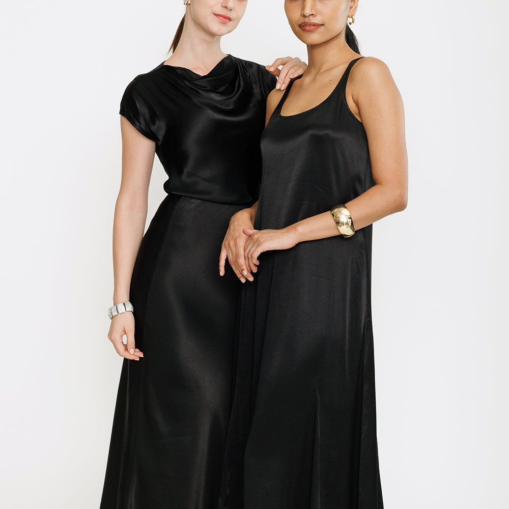 Discover the ultimate in adaptability with this multi-way dress in luxurious black satin, designed so you can wear either the rounded square neckline or high collar in front. Its flowing silhouette and elegant drape flatters every figure while providing maximum comfort. Slip this under a cropped jacket or blazer, or make a statement by accessorizing boldly.
